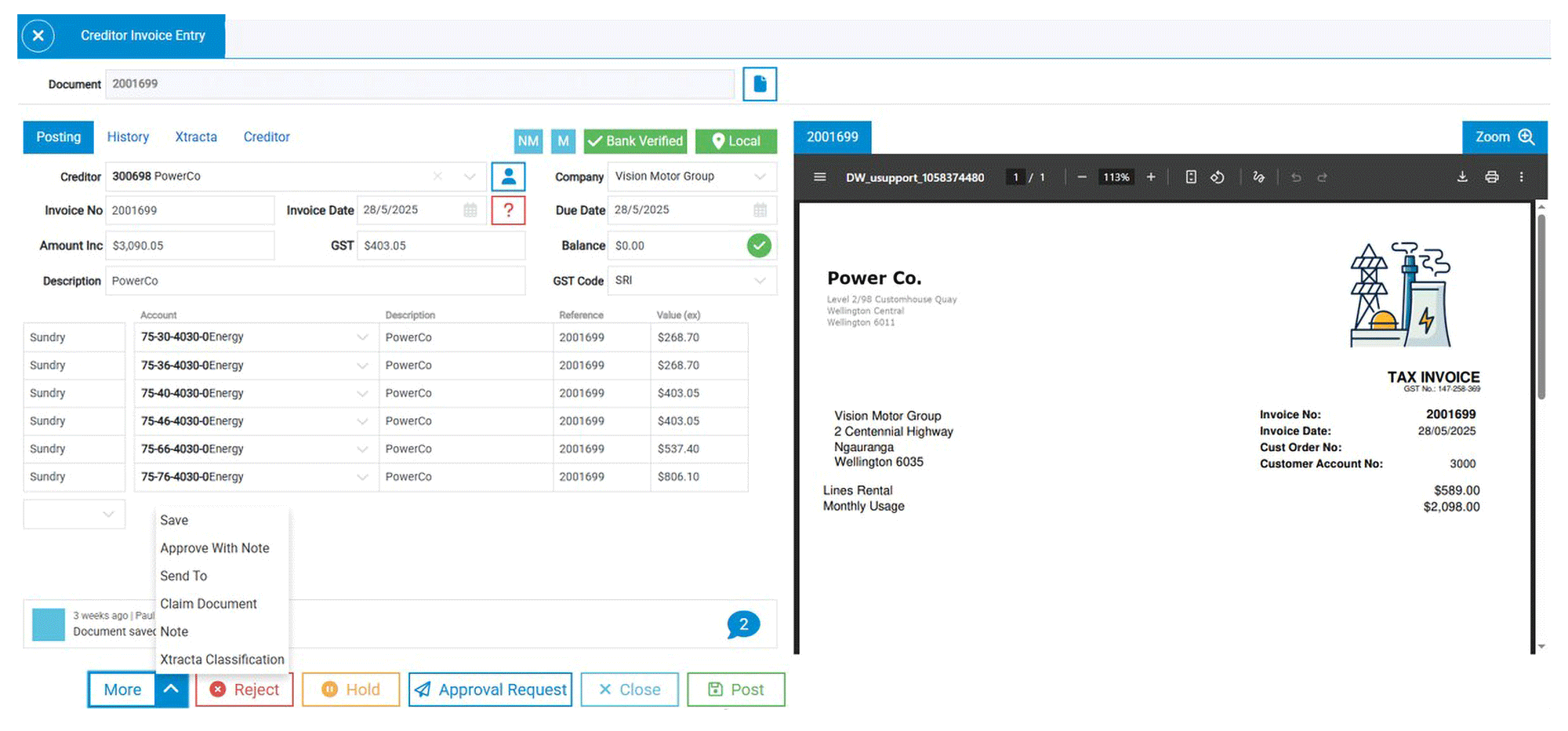 Fields are pre-filled in the Creditor Invoice screen, significantly reducing errors.